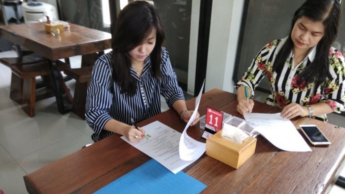 General Manager Business Tribun Pontianak, Julia Lorrains saat menandatangani MoU bersama owner Mato, Lindi, Sabtu (21/1/2018)
