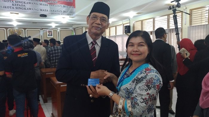Mantan Wali Kota Singkawang, Awang Ishak menerima hadiah kartu Tribun Family Card (TFC) Tribun Pontianak yang diberikan langsung oleh Pemimpin Perusahaan Julia Lorrains usai usai Sertijab Wali Kota dan Wakil Wali Kota Singkawang masa jabatan 2012-2017 kepada Wali Kota Singkawang dan Wakil Wali Kota Singkawang masa jabatan 2017-2022 di Kantor DPRD Kota Singkawang, Jalan Firdaus