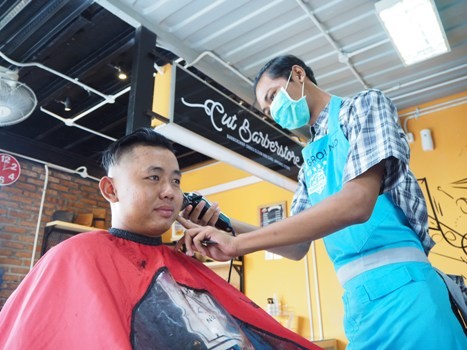 "Bisa segala macam model, sesuai keinginan customer. Kalau ingin sekalian cuci rambut, tinggal menambah 10.000 rupiah saja," tutur Landrik, koordinator outler Cut Barbershop.