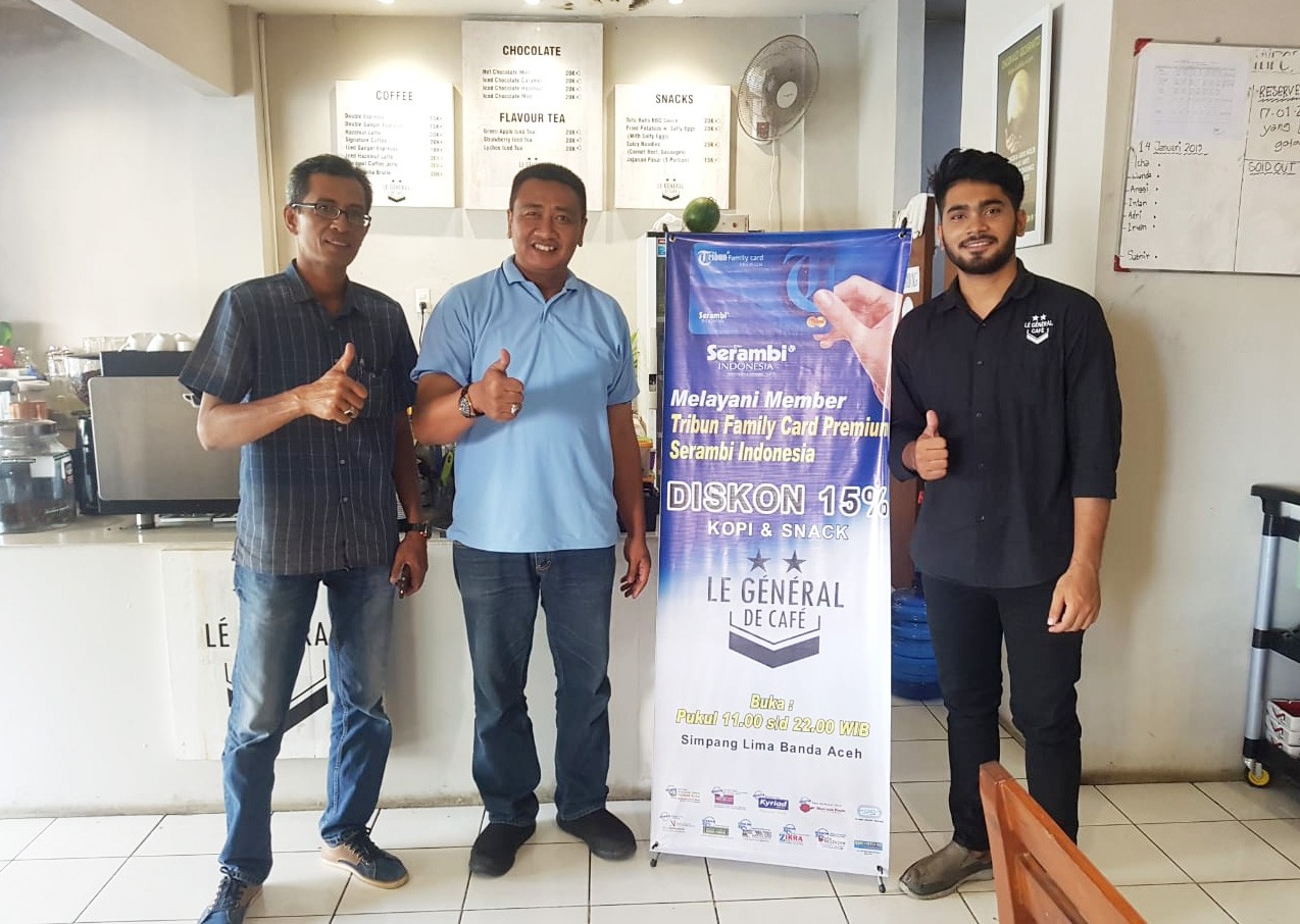 Syaiful Bahri PIC Tribun Family Card Serambi Indonesia menambahkan untuk memanfaatkan fasilitas diskon di La genral caffee, member TFC cukup dengan memperlihatkan kartu TFC yang masih berlaku baik jenis kartu fisik maupun versi digital yang tersimpan dalam aplikasi Android. Untuk bergabung menjadi member dapat menghubungi bagian Sirkulasi Hr Serambi Indonesi telp 0651-637350 WA 0811683003 (*)